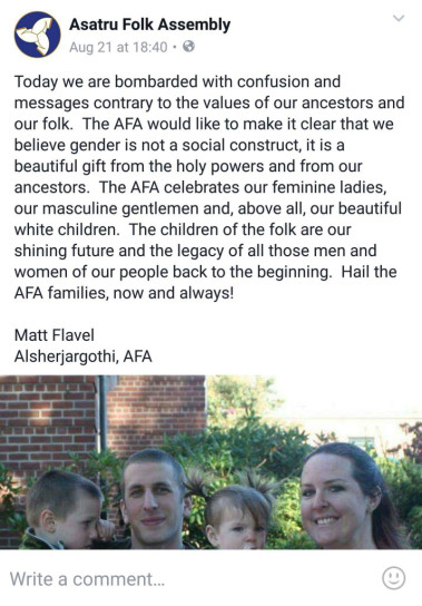 Yesterday the Asatru Folk Assembly was wrongfully banned for “offensive behavior” on Facebook. The AFA is one of the best known folkish Heathen groups in the U.S., which takes a traditional stance on Nordic paganism. They believe that Asatru, the modern revival of a magickal Heathenry, is the native spirituality of the Northern European people and one that norther Europeans should return to. And like almost every Pagan religion of old, they believe in biological gender.