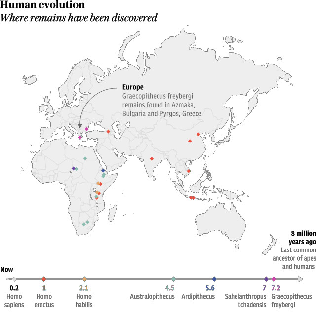 But two fossils of an ape-like creature which had human-like teeth have been found in Bulgaria and Greece, dating to 7.2 million years ago.